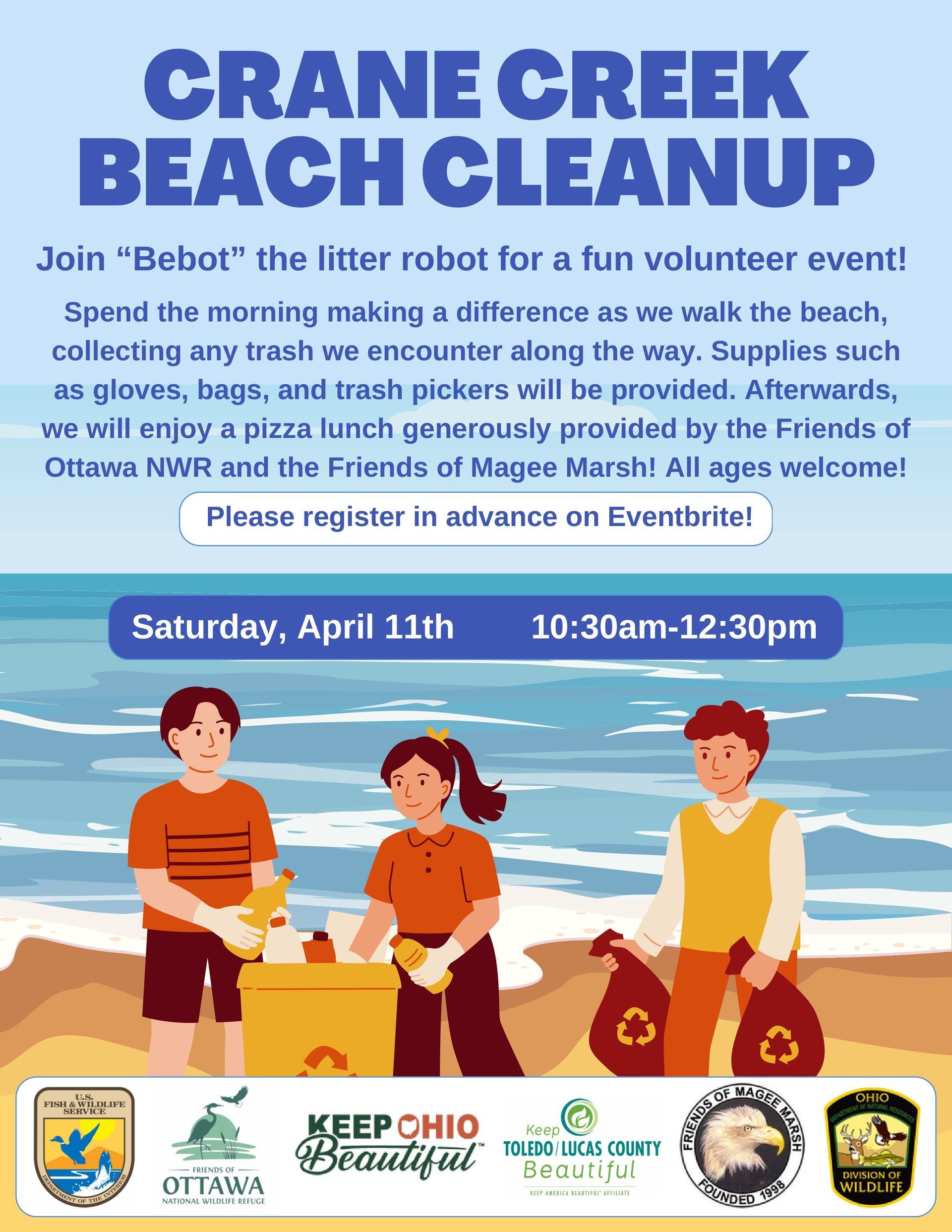 We’re partnering with Ottawa National Wildlife Refuge for a litter cleanup of Crane Creek Beach. Keep Ohio Beautiful's litter cleaning robot, BeBot, will also be in attendance!